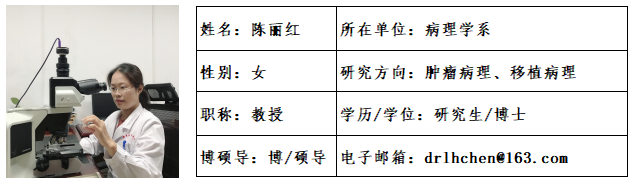 陈丽红,女,19748月,籍贯福建仙游,博士,教授,病理学系系主任,病理诊断中心副主任。国际肝胆胰协会中国分会MDT专业委员会常务委员,中国医学装备协会中国病理装备委员会第三届常务委员,福建省医学会病理学分会副主任委员,建省病理质控中心副主任,福建省肝病学分会常务委员。承担博士生、硕士生、本科生、海外医学生等的病理学理论课和实验课授课,并长期从事肝病病理、肝移植病理的临床诊断与研究工作,具有较丰富的肝病病理诊断经验,对肝癌和肝移植免疫耐受领域的研究情况和进展有深入的了解和掌握。曾在美国加州大学洛杉矶分校进修肝脏和肺脏病理。