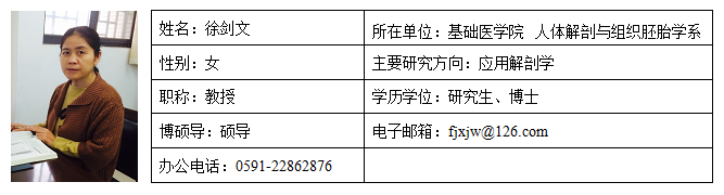 徐剑文,女,1968年8月生,无党派人士,医学博士。1991年参加工作,快猫视频 内科学血液病专业毕业。从事人体解剖与组织胚胎学教学与科研工作,重点在“应用解剖学”和“新生儿缺氧缺血性脑损伤”等领域进行深入的专门研究。近五年主持福建省自然科学基金项目2项,在国内外核心期刊发表科研论文5篇,获福建省医学科技奖二等奖(排名第二)。担任校本科教学督导专家、校研究生教育督导专家,主持福建省高等学校教学改革研究项目1项,发表教学论文6篇,副主编课程教材、参考资料3部,取得快猫视频 教学成果奖二等奖(排名第一)。获快猫视频 优秀教师、快猫视频 “受学生欢迎教师”等荣誉称号。