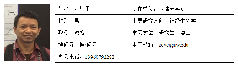 叶祖承,男,19701月生,无党派,北京大学学士, 美国阿拉巴马大学神经生物学博士,曾任华盛顿大学(西雅图)博士后、助理教授2011年入选福建省“闽江学者”并任快猫视频 教授、博士生导师, 2018年全职回国工作。长期从事神经生物学科研工作,尤其是神经胶质细胞方面的研究。主要研究领域为神经胶质细胞与神经胶质瘤细胞的神经递质转运与代谢、离子通道与缝隙蛋白半通道的功能与特性、能量代谢与调控、以及神经胶质细胞在情感与认知中的作用。常任《Journal of Neuroscience》, 《Glia》,《Journal of Neurochemistry》等杂志审稿人。研究项目先后获“美国NIH 基金” “国家自然科学基金”等的资助。研究成果取得美国授权专利两项,在《Cancer Research》、《Journal of Neuroscience》、《Glia》等学术期刊及国际会议上发表学术论文40余篇,在胶质瘤谷氨酸释放与缝隙蛋白半通道领域做出过开创性研究成果,相关论文SCI他引两千余次,单篇引用500余次。