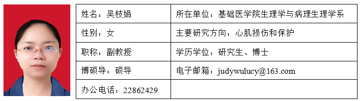吴枝娟,女,1979年9月出生,中共党员,医学博士。2004年参加工作,快猫视频 药理学专业博士。研究方向为心肌损伤及保护。近五年发表SCI论文4篇,曾获福建省自然科学优秀学位论文三等奖、校青年教师讲课比赛一等奖、中华医学会优秀教育成果二等奖。