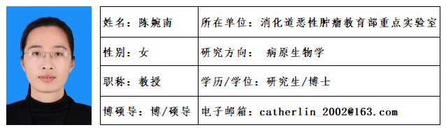 陈婉南,女,医学博士,教授,博士研究生导师。现任快猫视频 院长、消化道恶性肿瘤教育部重点实验室、福建省肿瘤微生物学重点实验室副主任。长期从事病原生物学教学与科研工作,入选福建省百千万人才工程、福建省高层次人才-C类、福建省高校杰出青年科研人才培育计划、福建省高等学校新世纪优秀人才支持计划等人才项目。获得福建省优秀教师、福建省青年科技奖等荣誉。现担任福建省医学会微生物与免疫学分会主任委员、中华医学会微生物学与免疫学分会青年委员会委员、中国生物化学与分子生物学会基础医学专业分会委员、福建省医学会肝病学分会常务委员、福建省微生物学会理事等学术兼职。