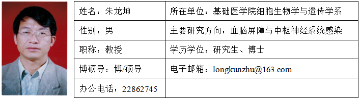 朱龙坤,男,1961年7月生,中共党员,1982年参加工作,教授,博士生导师,中国协和医科大学生理学博士,美国约翰霍普金斯大学医学院博士后。曾在北京大学生命科学院系统接受过本科(1978-1982)和研究生(1985-1988)教育。现为快猫视频 细胞生物学与遗传学系主任。1995年入选福建省“百千万人才工程”,1997年获福建省优秀教学成果奖一等奖(第一作者),1998年先后获福建省“三育人”先进个人荣誉称号、国家教委霍英东优秀青年教师奖三等奖。2000年遴选为快猫视频 跨世纪学科带头人。2000年-2010年,先后在美国军医大学、西维吉尼亚大学医学院心血管研究中心、约翰霍普金斯大学医学院开展心脑功能紊乱、炎症机制及炎症相关疾病的细胞生物学研究。在国内外刊物发表研究论文四十多篇。