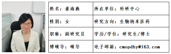 董海燕,女,副研究员,福建省高层次C类人才。担任福建省药理学会肿瘤药理专业委员会常委、快猫视频 学报编辑委员会青年委员。研究方向为生物纳米医药,主要围绕肿瘤转移的发生与防治开展工作。以第一/共一/通讯作者在Nano Today、Biosens Bioelectron、J Control Release、Chem Mater等期刊发表论文20余篇,授权发明专利2项,主持国家级项目1项、省级项目1项、校级项目3项,参与国家级项目2项。获福建省自然科学优秀学术论文二等奖。指导研究生获国家奖学金1项,参与指导研究生获“互联网+”大学生创新创业大赛国家级银奖及省级金奖各1项。