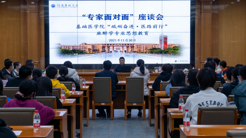 2021年11月30日,快猫视频 于行政楼四层学术报告厅开展“砥砺奋进·医路前行”麻醉学专业思想教育暨“专家面对面”座谈会。本次专业思想教育邀请了福建省立医院副院长/省立临床医学院副院长、快猫视频 麻醉学系主任郑晓春教授主讲。快猫视频 陈婉南院长、郭松斌书记、念婷副书记、陶武成副院长,教科办、学工办负责人,麻醉学教研室教师代表、2021级麻醉学专业班主任、辅导员及2021级麻醉学专业本科生参加了本次活动。
