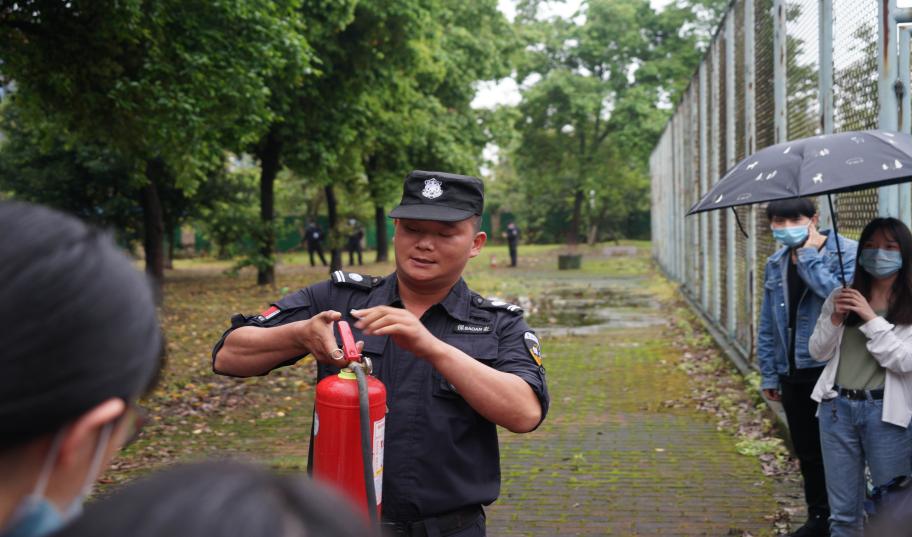 在油盘灭火实操环节,保卫处同志为参加演练的师生详细地讲解常用灭火器的类型和灭火器的正确使用方法,指导师生使用灭火器进行油盘灭火的实践操作。