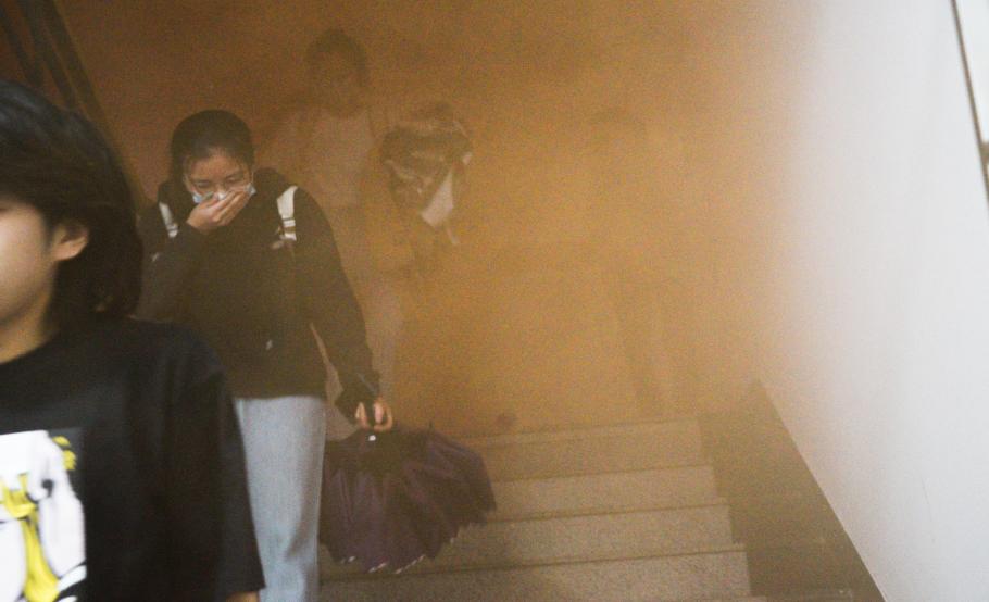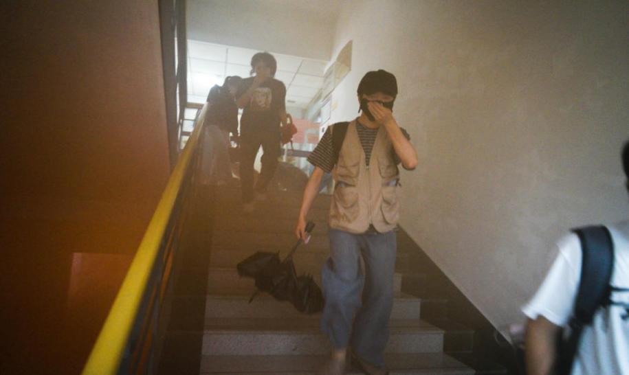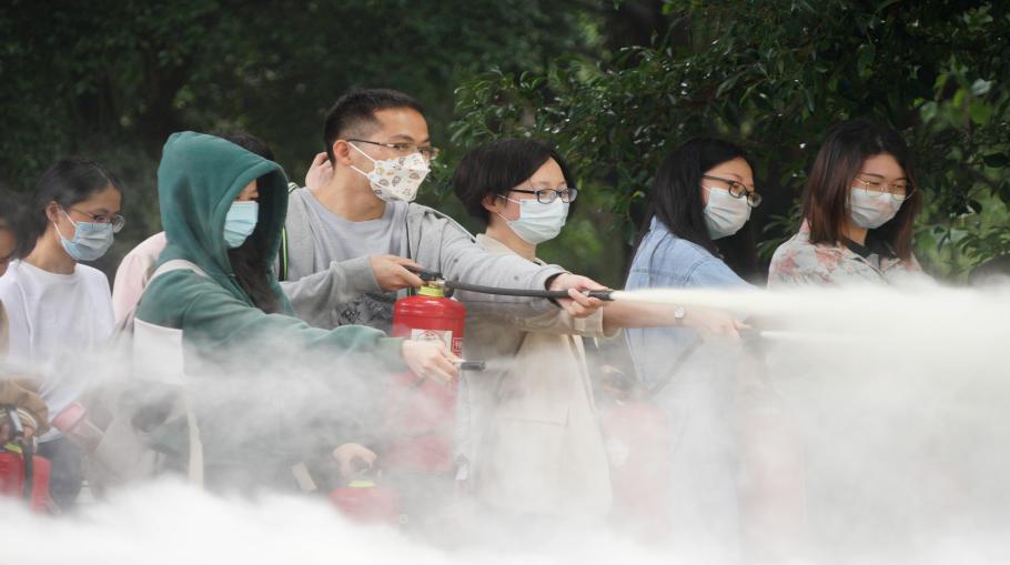 随后,逃生演练环节以实验室突发火情为背景,设置了模拟火情、模拟报警、模拟灭火、疏散人员等环节。参演师生们发现模拟火情后,迅速停止教学实验活动,用湿毛巾等捂住口鼻、弯腰从实验室前后门有序撤离,疏散组志愿者负责撤离途中秩序维护,师生沿消防指示标志快速、安全地撤离出大楼至空旷场地,应急人员清点人数、做好安抚工作,整个过程未发生拥挤、踩踏等安全事故。