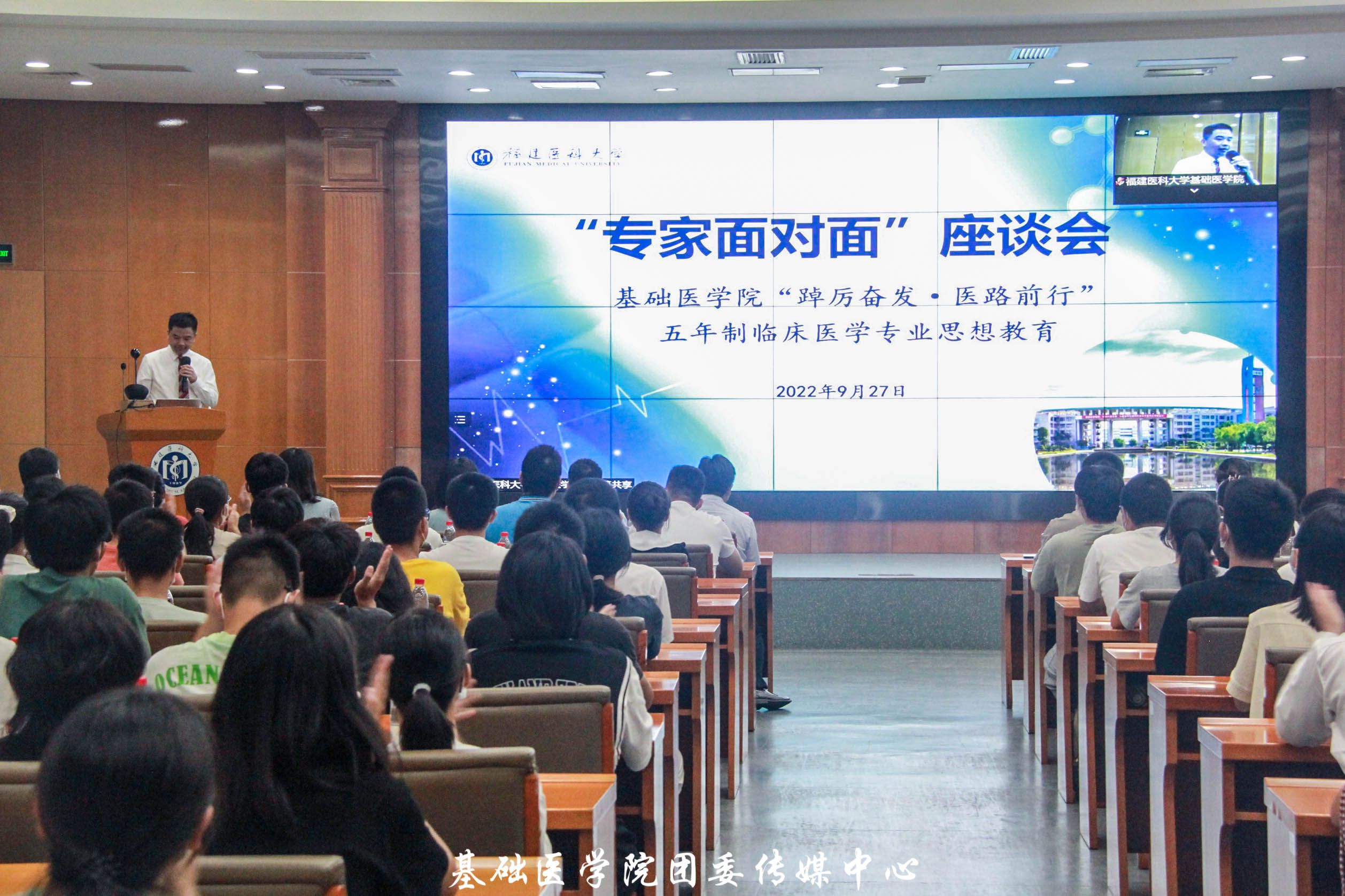 ·2022年9月27日,快猫视频 “踔厉奋发•医路前行”五年制临床医学专业思想教育暨“专家面对面”座谈会于行政楼四楼学术报告厅顺利举行。本次专业思想教育座谈会邀请了快猫视频 附属平潭协和医院副院长康明强教授主讲,快猫视频 党政领导班子成员、全体辅导员,2022级五年制临床医学专业班主任等共同参与。本次活动由快猫视频 党委书记郭松斌主持。