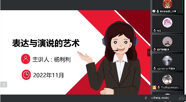 2022年11月5日下午,快猫视频 团委组织部举办了团委、学生会新成员培训班第三讲--表达与演说的艺术。此次培训采取线上宣讲的模式,邀请了国家三级心理咨询师杨利利老师来为快猫视频 团委、学生会的新成员进行表达方面的培训。