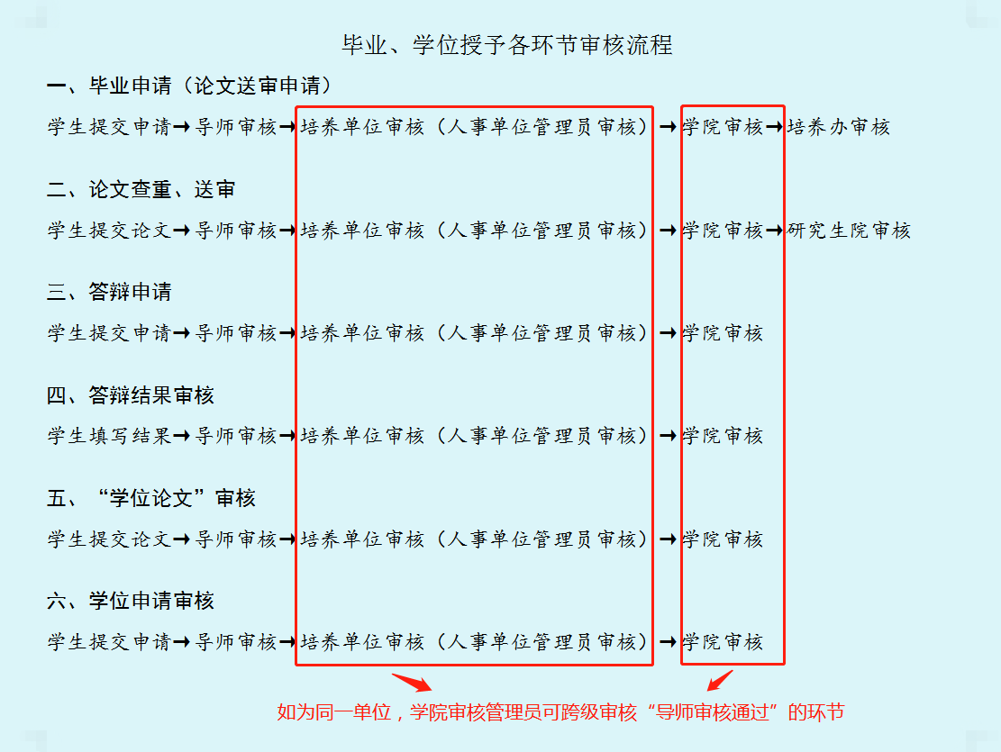 8.研究生提交学位申请 | 3月5日前 | 5月31日前 | 9月10日前 | 12月8日前 | 1.已符合授位标准的研究生,系统提交学位申请,并请导师 | |