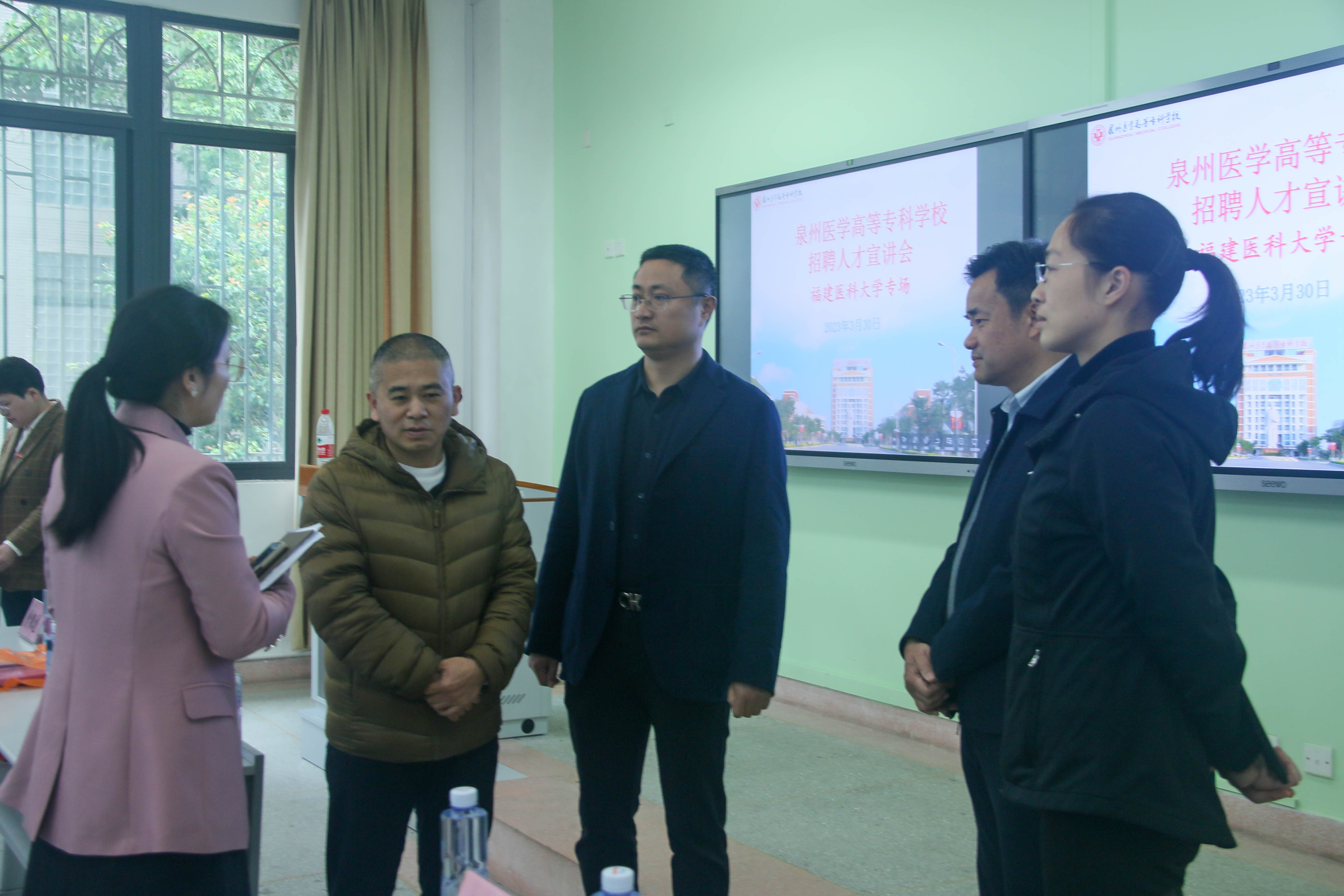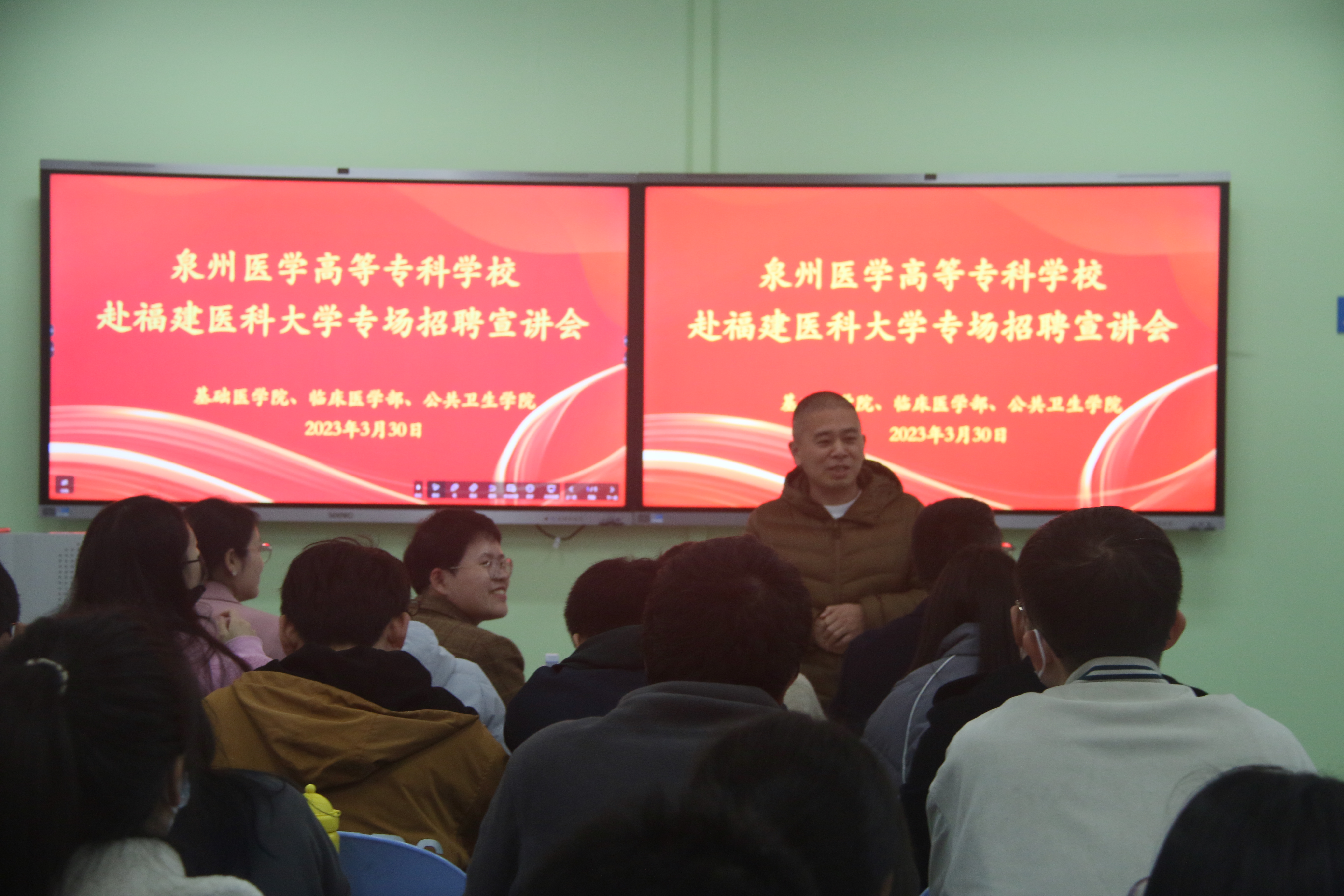 2023年3月30日下午,快猫视频 联合临床医学部、公共卫生学院在旗山校区第69教室,邀请泉州医学高等专科学校等单位来校进行校园宣讲和现场招聘。校学生工作处副处长曾银花、快猫视频 党委书记郭松斌、院长陈婉南参加。