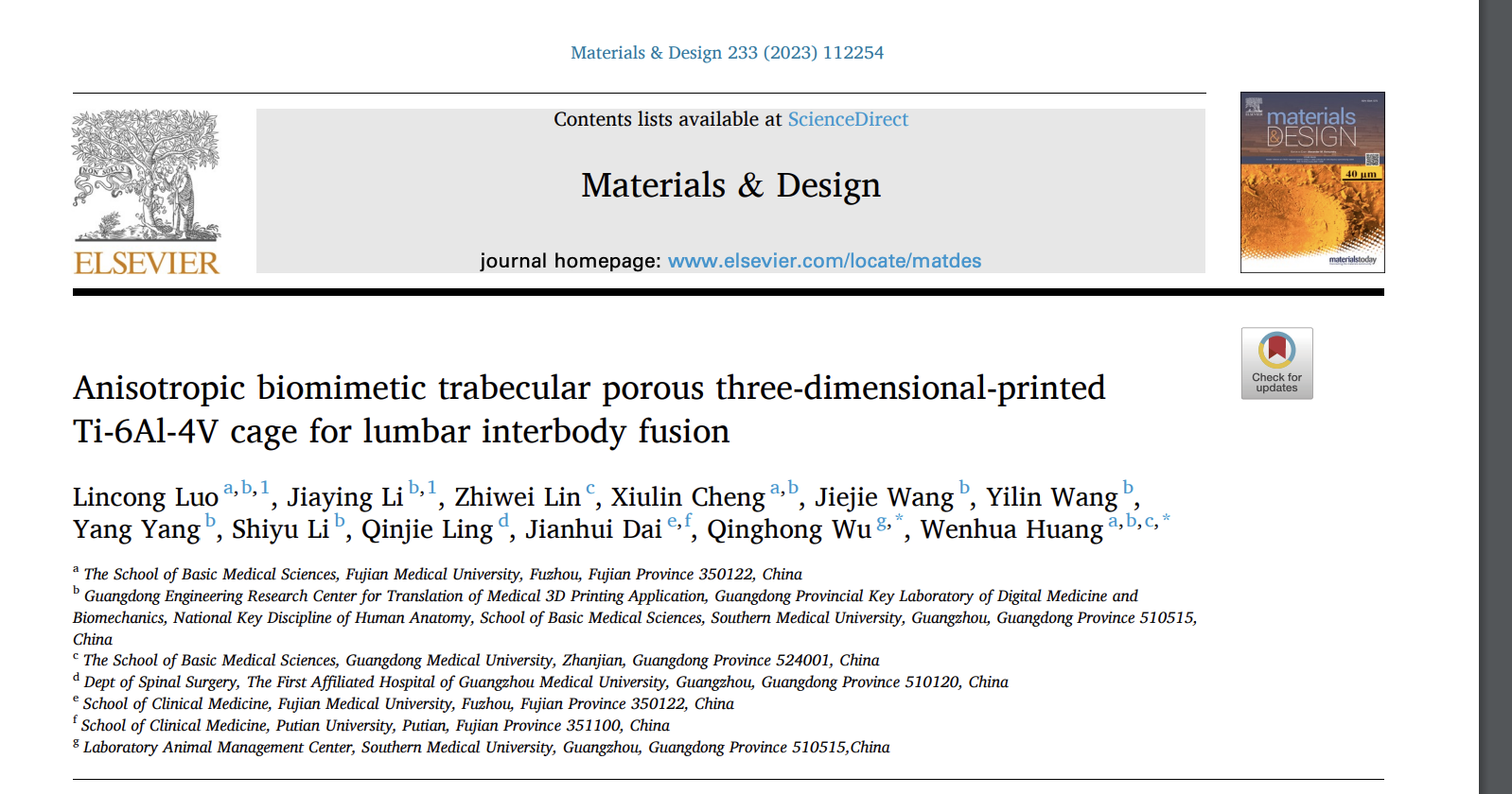 近日,快猫视频 客座教授黄文华团队在用于治疗退行性腰椎疾病3D打印椎间融合器方面取得进展,所撰写论文Anisotropic biomimetic trabecular porous three-dimensional-printed Ti-6Al-4V cage for lumbar interbody fusion(用于治疗退行性腰椎疾病的一种新型3D打印各向异性仿生骨小梁多孔Ti-6Al-4V椎间融合器)在Top期刊Materials & Design(《材料与设计》)以研究长文(Research Article)形式在线发表,该期刊2023年影响因子为8.4。