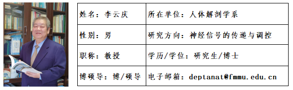 李云庆,男,1961年8月出生,河南新野人,博士研究生,空军军医大学教授/快猫视频 客座教授,博士生导师。现任中国解剖学会理事长、国际解剖学工作者协会联盟(IFAA)副主席、国际形态科学大会(ICSMS)和亚太地区解剖学会(APICA)执委、《神经解剖学杂志》主编、国际期刊《Frontiers in Neuroanatomy》副主编,国际期刊《Molecular Pain》、《Journal of Chemical Neuroanatomy》编委等职务。国务院学位委员会学科评议组第八届学科评议组成员。
