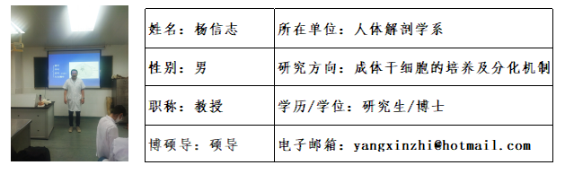 杨信志,男,1967年1月出生,山东即墨人,快猫视频 人体解剖学系教授, 2004年于日本冈山大学获得博士学位,2011年归国。对哺乳动物的体外受精及早期胚胎的发育有较深入的研究。目前感兴趣的研究领域集中在成体干细胞的研究,对输卵管内膜和子宫内膜干细胞的类器官培养和体外分化有较深入的研究,并在国内外杂志发表多篇相关论文。