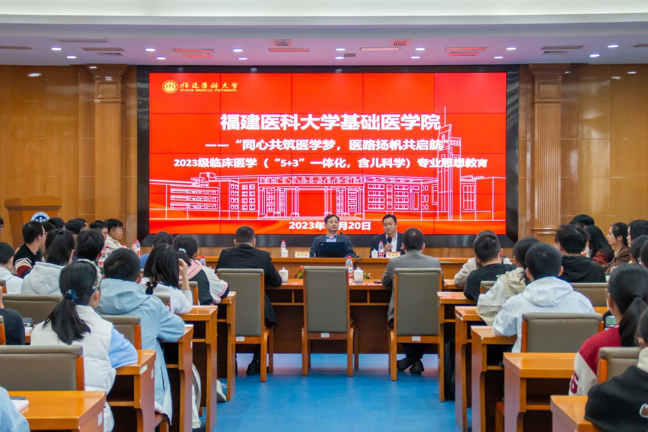 为着力培养适应中国“新医科”建设和健康中国战略需求的医学人才,引导新生明确应具备的职业素养并尽早做好发展规划,2023年11月20日,快猫视频 在第三会议室举办“同心共筑医学梦,医路扬帆共启航”——临床医学(“5+3”一体化,含儿科学)专业思想教育活动。本次活动邀请到快猫视频 副校长陈万金教授作为主讲人,学院党政领导班子成员、辅导员代表及2023级临床医学(“5+3”一体化,含儿科学)专业学生共同参与,快猫视频 党委书记郭松斌主持。