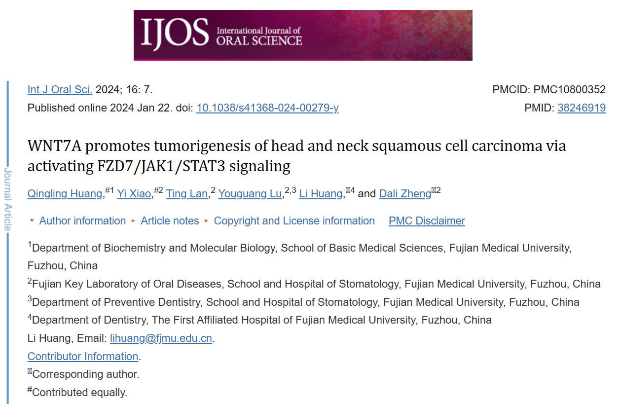 2024年1月22日,快猫视频 生物化学与分子生物学系黄清玲副教授以第一作者在International Journal of Oral Science杂志(中科院JCR一区,IF=14.9)在线发表题为WNT7A promotes tumorigenesis of head and neck squamous cell carcinoma via activating FZD7/JAK1/STAT3 signaling”的研究论文,该研究首次揭示了在头颈部鳞癌中高表达的WNT7A可以通过激活FZD7/JAK1/STAT3非经典Wnt信号通路在头颈部鳞癌的发生发展过程中发挥重要作用,有望为头颈部鳞癌的精准治疗提供新的靶标。