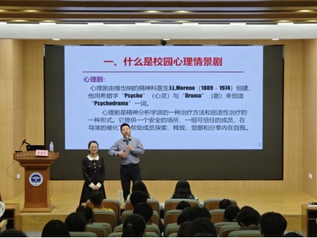 授课过程中,张老师用通俗易懂的语言深入浅出地讲解了心理剧和心理情景剧的区别,同时对演绎心理情景剧的一些常用技巧如“角色互换”“替身”“镜观”等进行了全面的介绍展示,让同学们对心理情景剧有了更深入的认识。