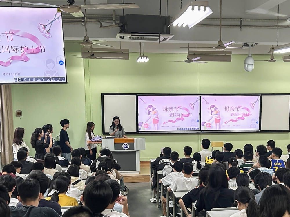 本次班会以一段温馨感人的视频开场。通过一位身为医护工作者的母亲穿梭在家庭与医院的生活视频,呈现了母亲的无私奉献和医护的使命担当,深深触动了在场每一位同学的心灵。紧接着,演讲者为同学们详细介绍了国际护士节与母亲节的由来,同学们对此有了更深刻的理解和认识。