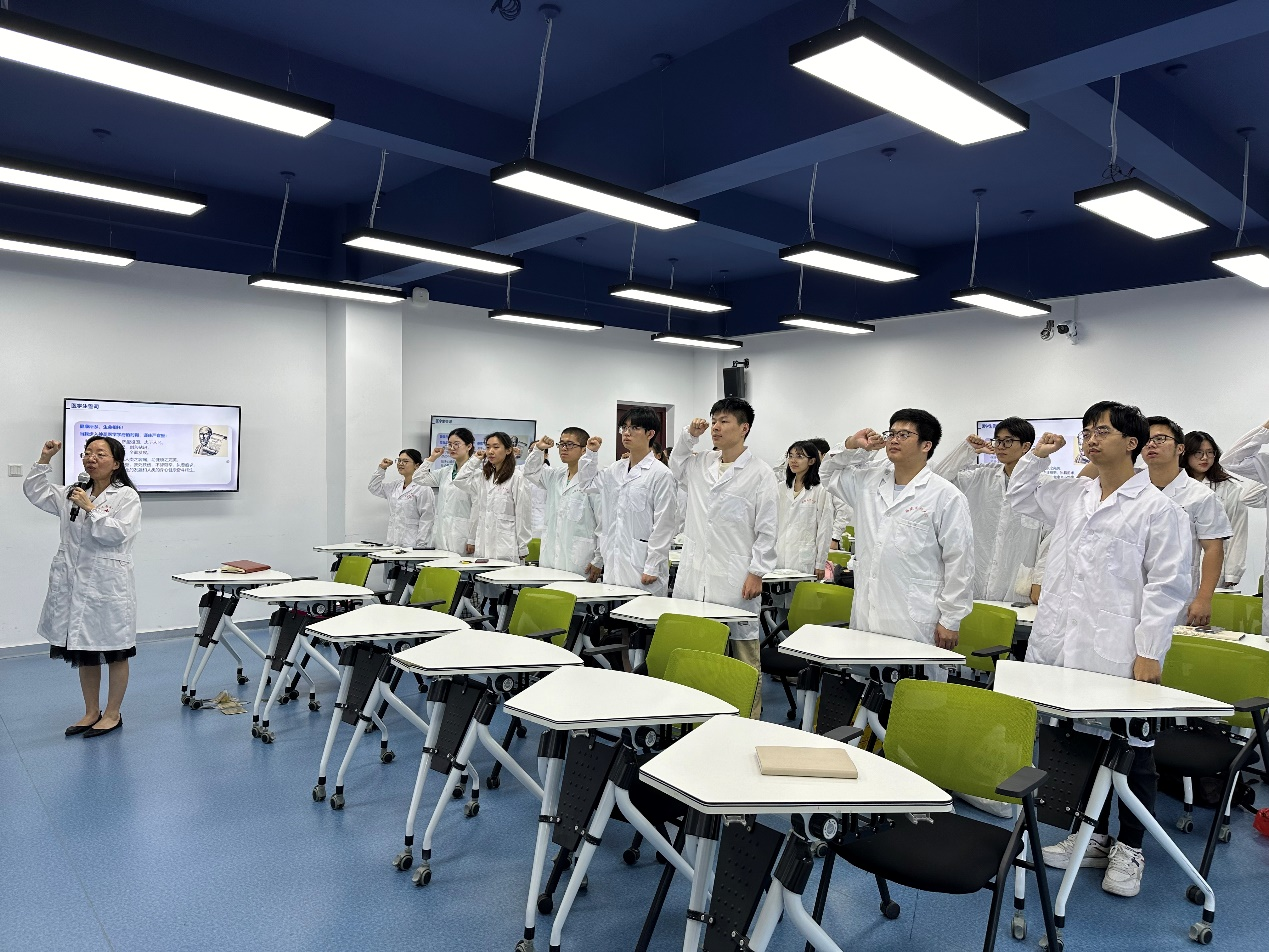 最后,宋斌主任带领全体2020级五年制基础医学专业学生穿着整齐的白大褂,重温庄严的医学生誓言。本次临床实习动员会,进一步提升基础医学专业学生对临床实习重要性的认识,为培养高素质的基础医学拔尖人才奠定了基础。