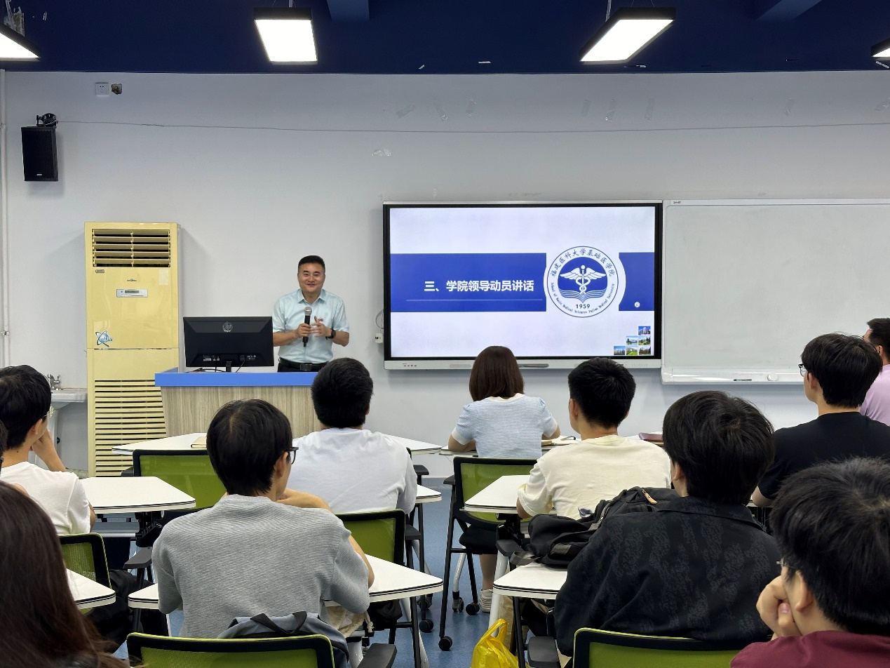 2020级基础医学专业本科生将于2024年6月-8月在福建省立医院金山院区开展为期12周的临床实习,为帮助学生更好适应和完成临床阶段的学习任务,2024年5月29日下午,快猫视频 在3号楼南区305智慧教室召开临床实习动员会。学院党委秦雷副书记、罗道枢副院长、教科办宋斌主任、学工办杨翠玥主任、辅导员陈洁瑶老师,以及2020级基础医学专业全体学生参加本次动员会。