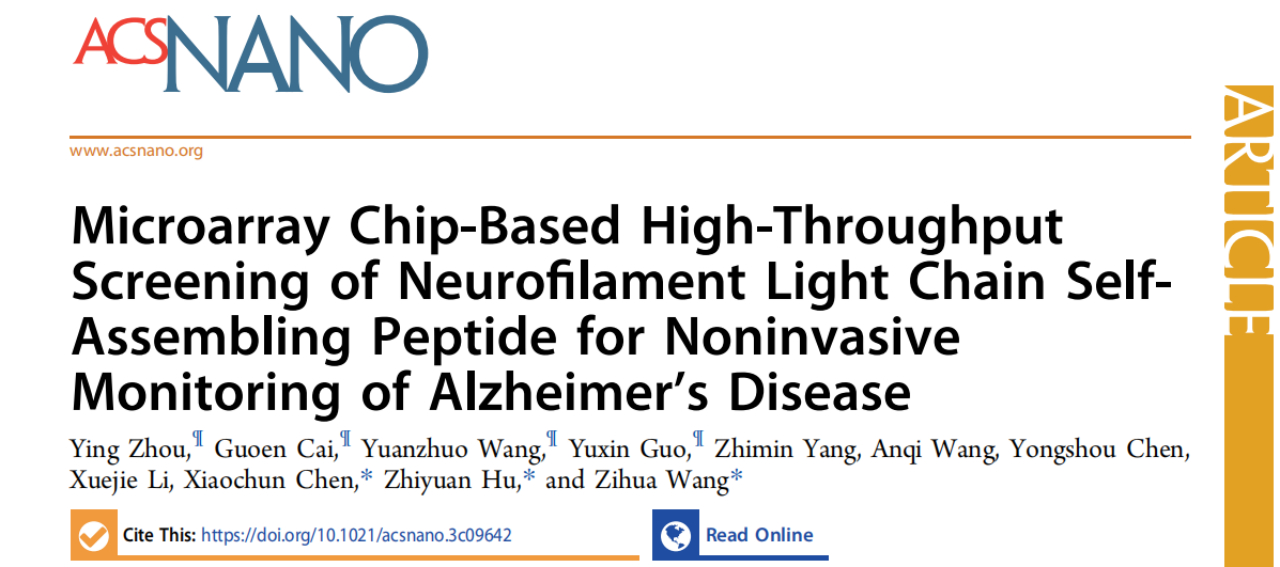 2024年6月28日,快猫视频 王子华副研究员、胡志远教授团队、快猫视频 附属协和医院陈晓春教授团队合作在材料学顶级期刊《ACS Nano》(中科院1区TOP期刊、影响因子15.8)在线发表了题为“Microarray Chip-Based High-Throughput Screening of Neurofilament Light Chain Self-Assembling Peptide for Noninvasive Monitoring of Alzheimer’s Disease”的研究论文。该研究开发了一种基于微流控芯片的高通量筛选方法,可获取靶向神经丝轻链蛋白(neurofilament light chain,NfL)的自组装多肽。通过直接“翻印”并进一步分析自组装多肽的序列、形貌、亲和力,鉴定得到高结合亲和力、高特异度、成本较低的Pep-NfL多肽自组装体。在AD小鼠模型和细胞系中,Pep-NfL呈现了优异的NfL结合特性。在临床环境中,Pep-NfL多肽自组装体可用于血浆NfL的检测并区分AD患者、轻度认知障碍(mild cognitive impairment,MCI)患者和对照组。研究人员通过开发的高通量筛选系统,筛选鉴定出了靶向NfL且结合亲和力高的Pep-NfL自组装多肽,在区分AD血液样本和对照组血液样本、甚至MCI血液样本中展现出巨大潜力。鉴于MCI具有向AD痴呆转归的高可能性,针对MCI阶段的干预可能是延缓AD发生最为有效的策略。因此,AD的无创早期监测至关重要。本研究开发的Pep-NfL平台具备检测时间快、检测敏感度高、经济型、简易型等诸多优点,有望用于即时监测疾病进程。
