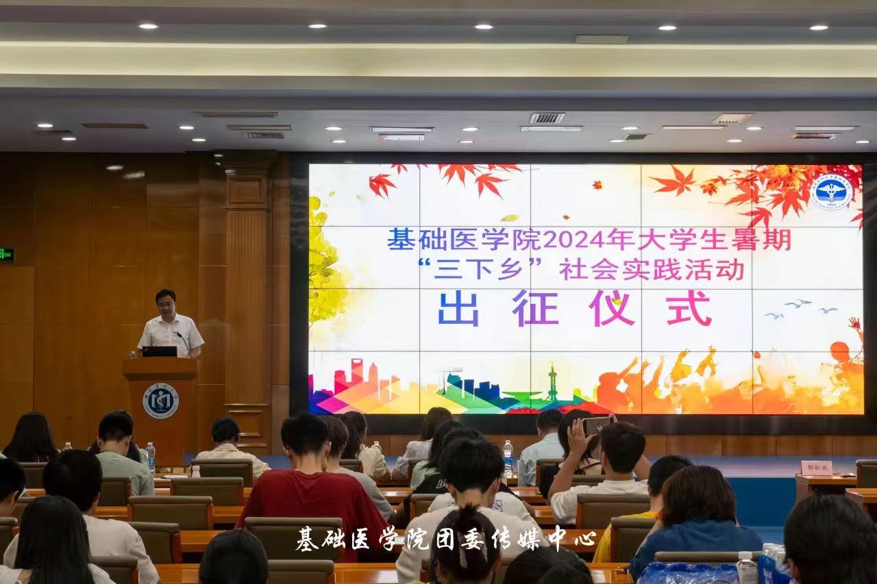 7月8日晚,快猫视频 在行政楼学术报告厅隆重举行2024年暑期“三下乡”社会实践出征仪式。学院党委书记郭松斌、党委副书记秦雷、团委书记杨翠玥,近100名实践队师生代表参加了本次出征仪式。