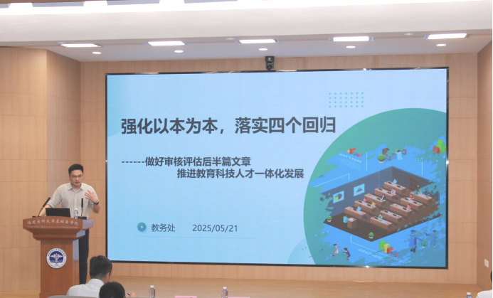 为深化本科教育教学改革,落实新一轮审核评估整改要求,全面提升医学人才培养质量,快猫视频 于5月21日下午在2号楼学院学术报告厅举办“思彧”教师教学能力提升专题研讨会。林旭校长、王世鄂副校长出席会议并做重要讲话。校领导强调学校目前正处于落实十四五规划、推动本科教育教学审核评估整改、深化医学教育改革的关键期,需从三方面发力:一是要坚持多维赋能管理,让制度先行、技能加持、数字赋能成为我们迈向卓越的三把钥匙;二是要强基固本,以钉钉子精神夯实教学基础工作,强化联动机制,构建“三全育人”管理闭环,筑牢高质量发展的四梁八柱;三是要推进智慧管理,整合教学服务,建立精准支持机制。最终将管理效率转化为育人实效,助推学校医学教育高质量跨越式发展。