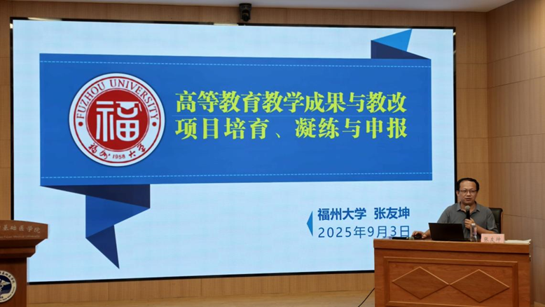 本次讲座特邀福州大学发展规划与学科建设处副处长、教务处原副处长张友坤做“高等教育教学成果与教改项目的培育、凝练与申报”为主题的专题讲座。张友坤副处长凭借其在高等教育领域多年的丰富经验和对教学成果、教改项目申报工作的深入研究,系统梳理了当前高等教育教学成果与教改项目的发展趋势和政策导向,结合最新的申报要求,详细解读了项目申报的重点、难点以及注意事项,并结合教学成果申报具体案例展示、教学成果的内涵与特征、教学成果的培育与锻造、教学成果的撰写与申报等四个维度,指导申报书撰写、材料规范组织、成果亮点挖掘等方面进行了深入剖析。在教学成果培育与凝练环节,张友坤副处长介绍了如何立足日常教学实践,聚焦教学改革中的关键问题,注重成果的创新性、实用性和可推广性,通过持续积累和系统梳理,以形成具有特色的教学成果,为在场的教师们提供了清晰的思路和极具价值的指导。