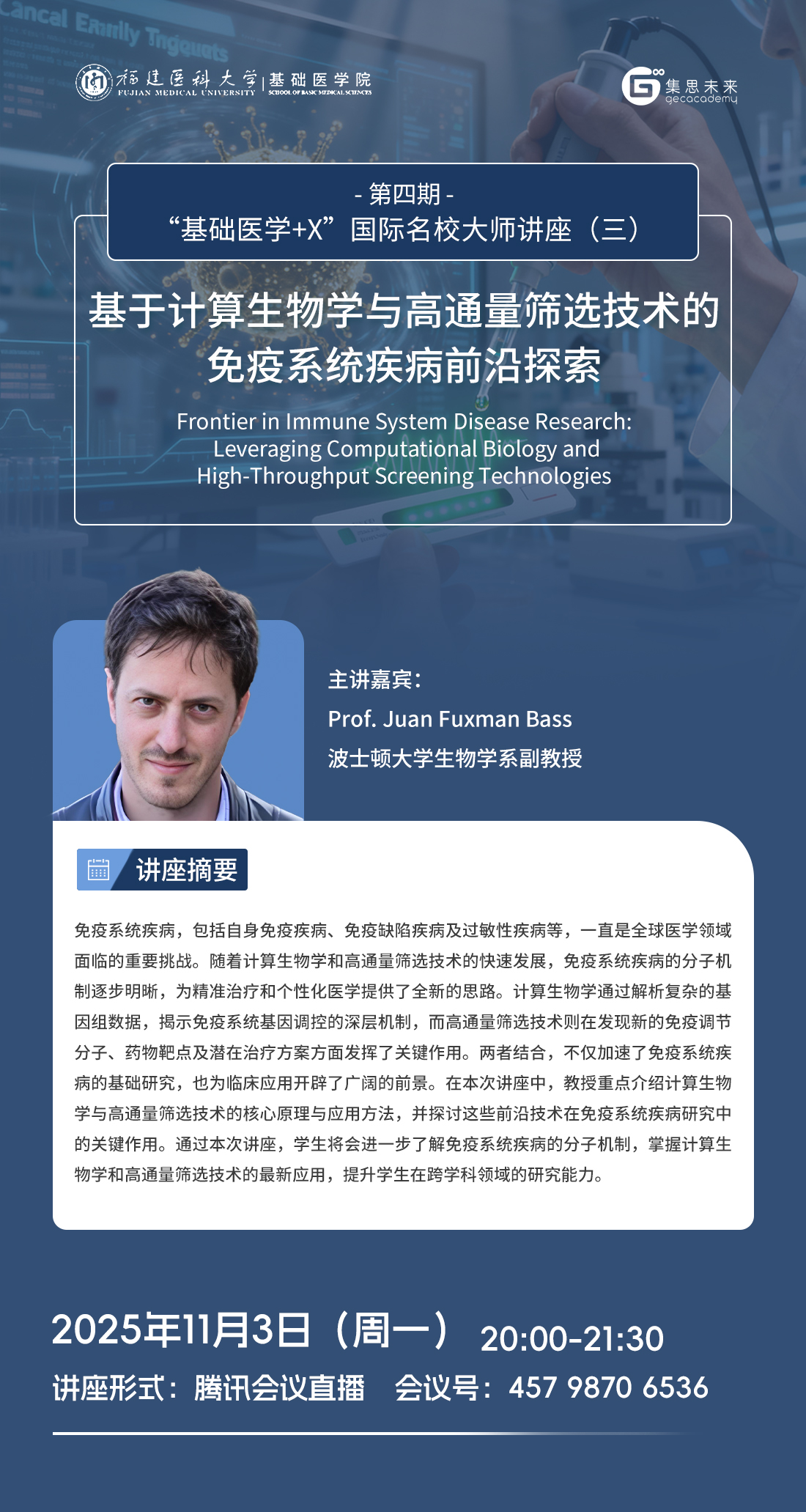 为促进学生了解以人工智能、大数据为代表的新一轮科技革命和产业变革下锚定基础医学疾病诊疗与研究的前沿研究方向与方法,探索医学与其他学科的交叉应用,培养国际化视野,探讨国际研究趋势和动态。快猫视频 联合天津集思教育集团继续开展第四期“基础医学+X”国际名校大师讲座,主讲嘉宾为来自全球一流高等学府和研究机构的9位知名教授。现将该系列讲座(三)相关信息发布见下: