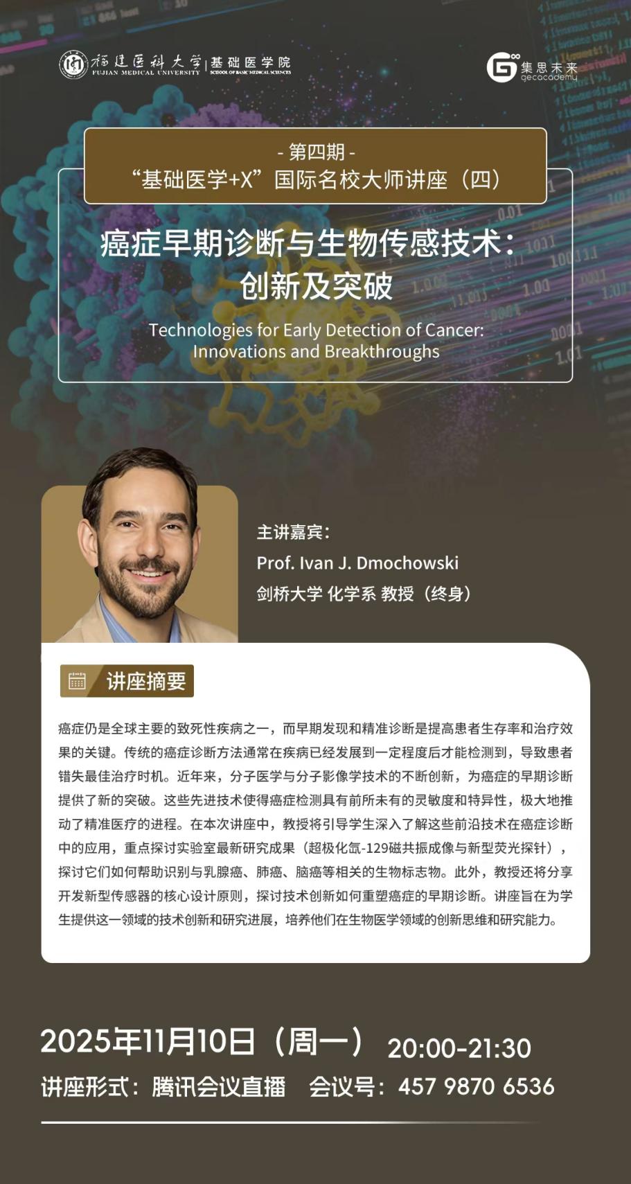 为促进学生了解以人工智能、大数据为代表的新一轮科技革命和产业变革下锚定基础医学疾病诊疗与研究的前沿研究方向与方法,探索医学与其他学科的交叉应用,培养国际化视野,探讨国际研究趋势和动态。快猫视频 联合天津集思教育集团继续开展第四期“基础医学+X”国际名校大师讲座,主讲嘉宾为来自全球一流高等学府和研究机构的9位知名教授。现将该系列讲座(四)相关信息发布见下: