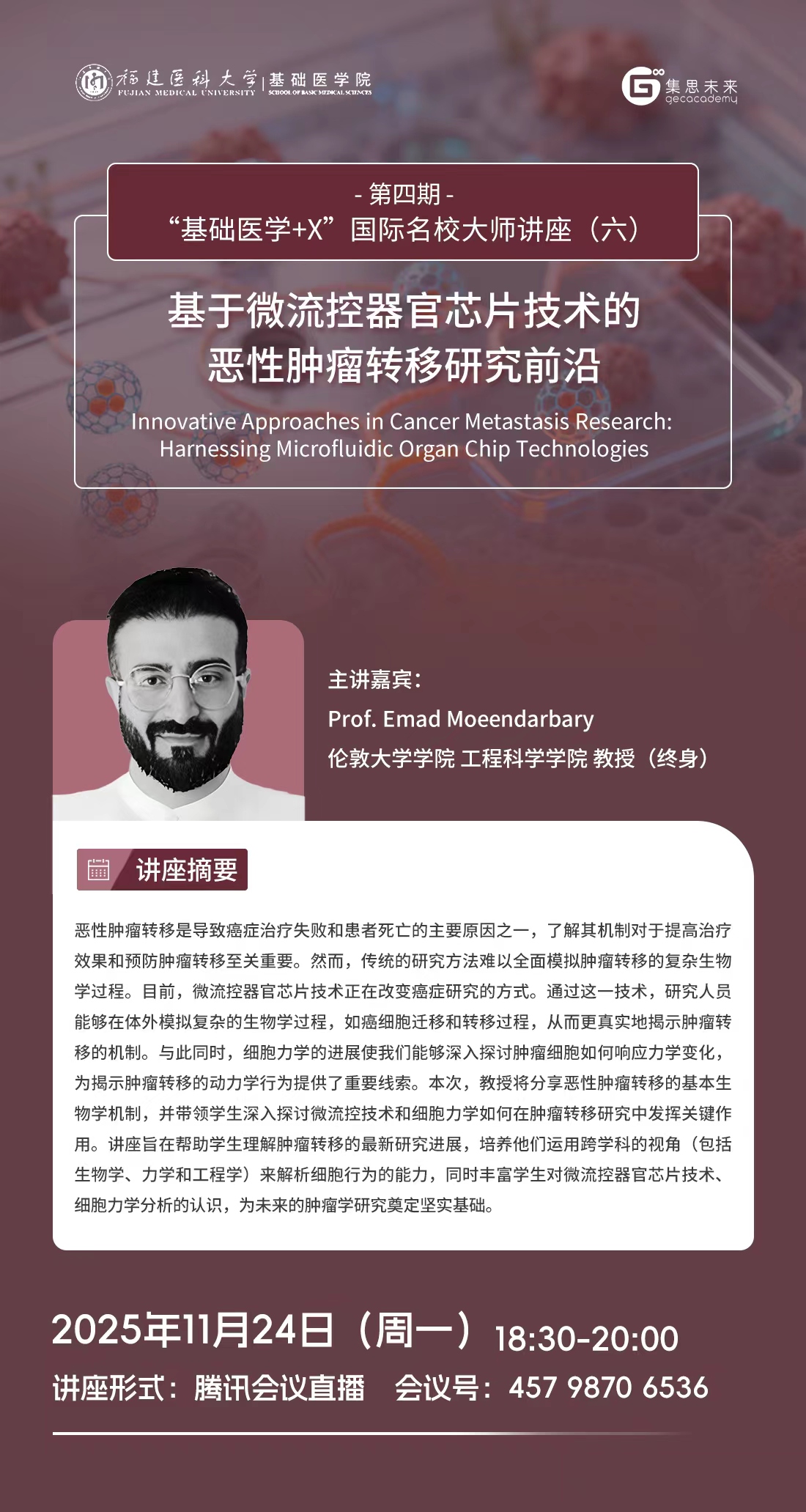 为促进学生了解以人工智能、大数据为代表的新一轮科技革命和产业变革下锚定基础医学疾病诊疗与研究的前沿研究方向与方法,探索医学与其他学科的交叉应用,培养国际化视野,探讨国际研究趋势和动态。快猫视频 联合天津集思教育集团继续开展第四期“基础医学+X”国际名校大师讲座,主讲嘉宾为来自全球一流高等学府和研究机构的9位知名教授。现将该系列讲座(六)相关信息发布见下: