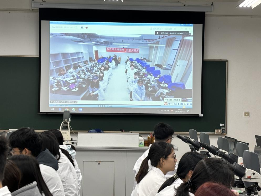 快猫视频 罗道枢副院长在活动致辞中对此次云端互动教学模式给予了高度评价,认为这是东西部医学教育资源深度融合的生动实践,更是形态学实验教学模式创新的有益探索。活动现场,刘卉教授与王学炆老师组织2025级麻醉学专业学生,在3号楼南304形态学实验室积极参与空中课堂,课堂气氛热烈,互动频繁。