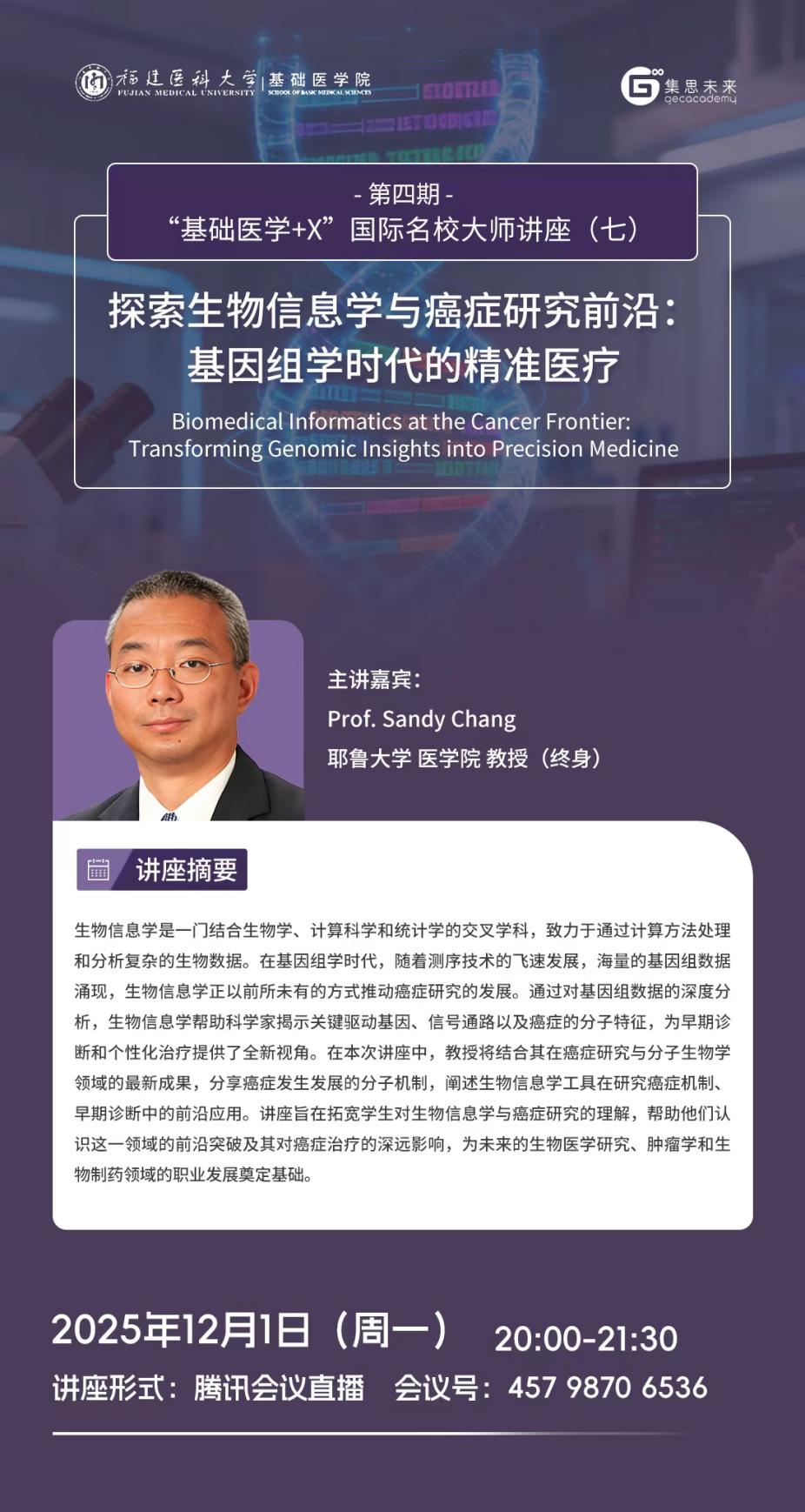 为促进学生了解以人工智能、大数据为代表的新一轮科技革命和产业变革下锚定基础医学疾病诊疗与研究的前沿研究方向与方法,探索医学与其他学科的交叉应用,培养国际化视野,探讨国际研究趋势和动态。快猫视频 联合天津集思教育集团继续开展第四期“基础医学+X”国际名校大师讲座,主讲嘉宾为来自全球一流高等学府和研究机构的9位知名教授。现将该系列讲座(七)相关信息发布见下: