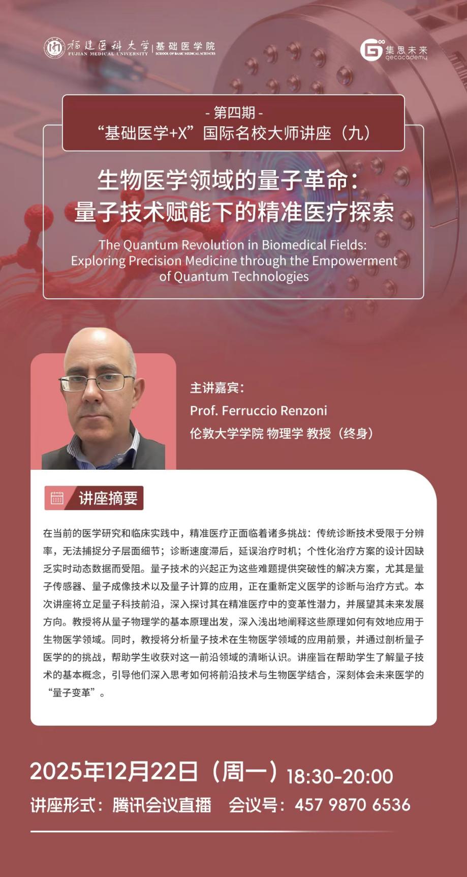 为促进学生了解以人工智能、大数据为代表的新一轮科技革命和产业变革下锚定基础医学疾病诊疗与研究的前沿研究方向与方法,探索医学与其他学科的交叉应用,培养国际化视野,探讨国际研究趋势和动态。快猫视频 联合天津集思教育集团继续开展第四期“基础医学+X”国际名校大师讲座,主讲嘉宾为来自全球一流高等学府和研究机构的9位知名教授。现将该系列讲座(九)相关信息发布见下: